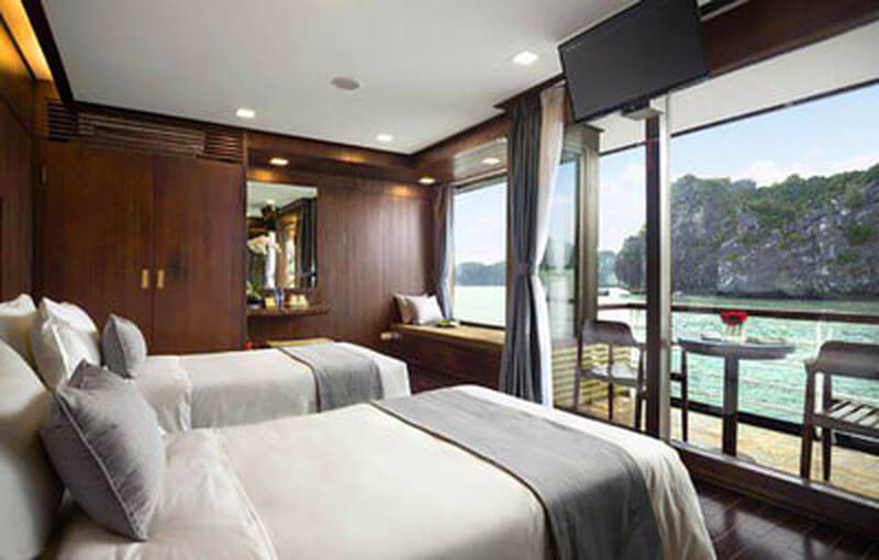 If you opt to extend your tour, you’ll be floating in a luxurious cabin like this one through the surreal scenery of the limestone karsts in Ha Long Bay. According to Vietnamese legend, each karst is the exact spot where a dragon touched done in ancient times coming to defend his beloved Vietnamese children from invading Chinese forces.
