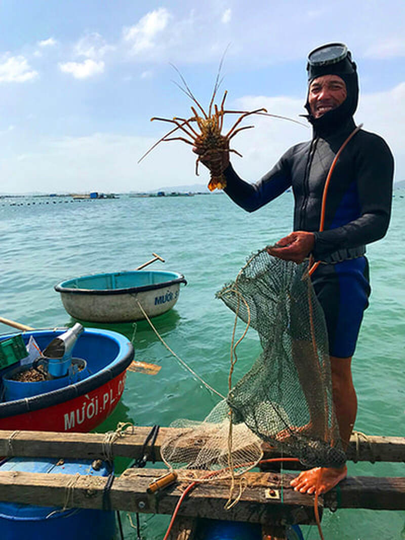 This is my good friend Muoi holding a tiger lobster - Southeast Asia’s most expensive and sought after fish. On your tour, we’ll visit his fish farm in the South China Sea and he’ll dive for these very same lobsters for your lunch!