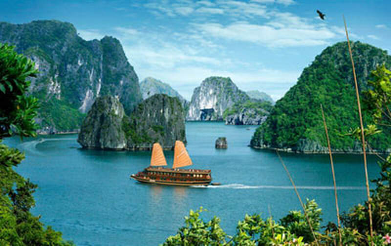 A "Chinese junk boat" sails through stunning Ha Long Bay. You’ll be on a luxury version of this boat sailing through scenes just like this one!