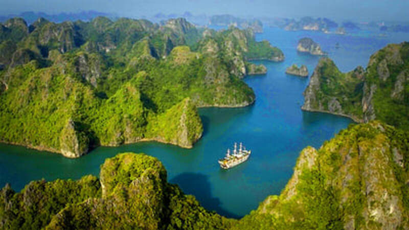 A "Chinese junk boat" sails through stunning Ha Long Bay. If you join the optional tour extension, you’ll be on a luxury version of this boat sailing through scenes just like this one!